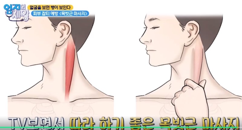 - 목빗근 마사지 : 손을 갈고리 모양으로 만들어 목빗근을 부드럽게 10초 동안 잡고, 고개를 반대쪽으로 돌린 후 다시 10초간 잡아줍니다.