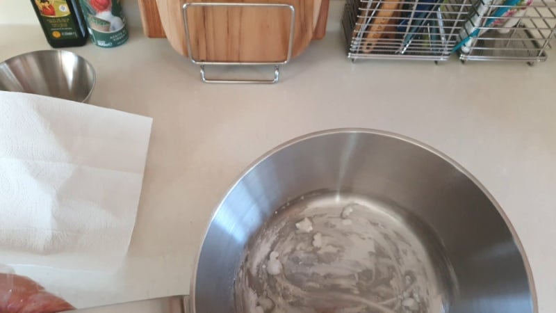 - 밀가루를 골고루 뿌린 후 부드러운 천이나 키친타월을 이용해 원을 그리듯 문지릅니다.